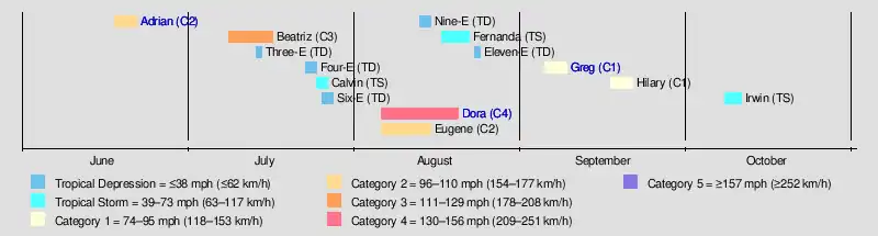Tropical cyclogenesis began with Hurricane Adrian, which developed on June 18. Although it remained offshore, Adrian brought rough surf and flooding to Mexico, which resulted in 6 fatalities. The storm peaked as a Category 2 before dissipating on June 22. No other tropical cyclones formed in June. Activity halted until July 9, when Hurricane Beatriz developed. Though it peaked as a Category 3 hurricane before dissipating on July 17, the storm caused no damage on land because it remained well offshore. The next system, a short-lived Tropical Depression Three-E, did not result in impact as a tropical cyclone,[2] though the precursor brought heavy rainfall and gusty winds to Central America.[3][4] Tropical Depression Four-E, was the first of three cyclones to cross into the Central Pacific Hurricane Center's area of responsibility, which is between 140°W and the International Date Line.[5] Two other short-lived system in July, Tropical Storm Calvin and Tropical Depression Six-E, caused no damage.[2]