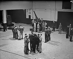 Men of a TA battery training on a 3-inch gun at their drill hall in 1938.
