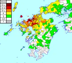 The Japan Meteorological Agency referred to the earthquake as the "Earthquake off the western coast of Fukuoka Prefecture" in their press release.[8] While Fukuoka Prefecture and Fukuoka City, as well as major media outlets such as the Asahi Shimbun and NHK, used "Fukuoka Prefecture Western Offshore Earthquake."[9] The Nishinippon Shimbun and Yomiuri Shimbun used "Fukuoka Offshore Earthquake," and the Mainichi Shimbun used "Fukuoka Offshore Genkai Earthquake."[10] Due to slight differences in Japanese grammar and Kanji usage, the names differ slightly in wording and structure among Japanese media, but all refer to the same event and generally have the same meaning.