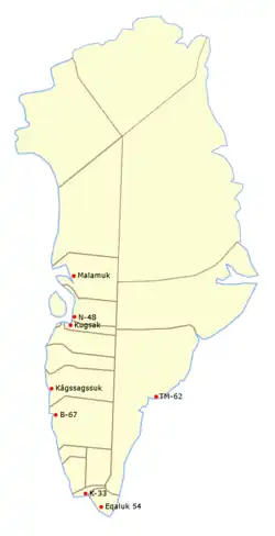Location of teams participating in the 2007 Greenlandic Men's Football Championship.