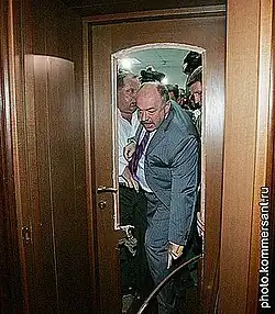Recently dismissed Prosecutor General of Ukraine Svyatoslav Piskun breaking into his office, surrounded by Members of the State Protection Department on 24 May 2007.