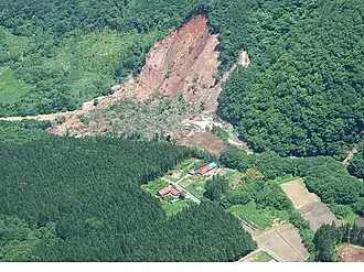 Landslides triggered by this earthquake crushed structures, buried people, cut off access to certain roads, and isolated some rural communities.[11] Mud from landslides dammed up rivers to form lakes called "quake lakes" (せき止め湖, sekitomeko).[12]