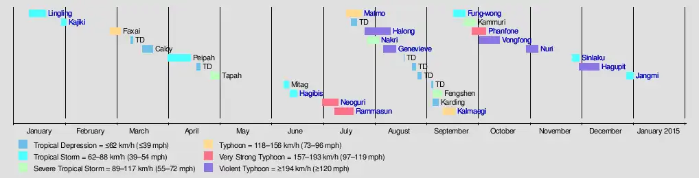 Tropical Storm Jangmi (2014)Typhoon Hagupit (2014)Tropical Storm Sinlaku (2014)Typhoon Nuri (2014)Typhoon Vongfong (2014)Typhoon Phanfone (2014)Tropical Storm Fung-wong (2014)Typhoon Kalmaegi (2014)Hurricane Genevieve (2014)Tropical Storm Nakri (2014)Typhoon Halong (2014)Typhoon Matmo (2014)Typhoon RammasunTyphoon Neoguri (2014)Tropical Storm Hagibis (2014)Tropical Storm Kajiki (2014)Tropical Storm Lingling (2014)