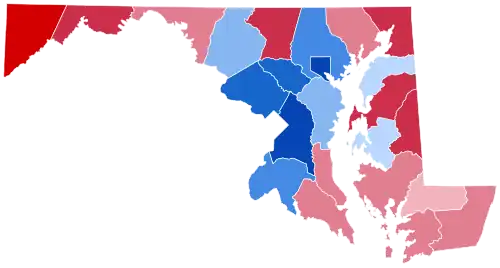 Biden easily carried Maryland with 65.4% of the vote to Trump's 32.2% (a margin of 33.2%, significantly larger than Hillary Clinton's 26.4% in 2016). Prior to the election, all news organizations projecting the election considered Maryland a state that Biden would carry comfortably. Maryland has long been a Democratic-leaning state, and no Republican presidential candidate has won it since George H. W. Bush in 1988. Biden carried the Black-majority, suburban counties of Prince George's County and Charles County with over 80% and 60% of the vote respectively, Baltimore City with almost 90% of the vote, and the white-majority, suburban counties of Montgomery, Howard, and Baltimore with over 60% each. While Republicans typically win more counties by running up margins in more rural western Maryland and the Eastern Shore, the Baltimore-Washington area casts over three-fourths of the state's vote, making it difficult for a Republican to carry Maryland. While Trump won 14 of Maryland's 24 county-level jurisdictions, Biden won the six largest, all of which are part of the Baltimore-Washington area–Montgomery, Prince George's, Anne Arundel, Howard and Baltimore counties and Baltimore City–by over a million votes collectively, more than enough to carry the state.