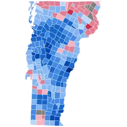 Biden easily emerged victorious in the Green Mountain State 66.09% to 30.67%, a margin of 35.4%. This is the first time Vermont was the strongest state for either party since 1956, when it was Republican Dwight D. Eisenhower's best state. Vermont also saw the largest increase in turnout from 2016, increasing 14.3%.[4] Biden greatly improved on Hillary Clinton's 55.7% vote share and 25.9% margin from 2016, when third-party candidates received over 14% of the vote; with an improvement of 9% in the margin of victory, this marked the strongest leftward shift any state experienced in 2020.[5] Biden's performance was also the fourth-strongest Democratic performance in state history, as well as the third-largest Democratic margin of victory. Trump carried only one county, sparsely populated Essex bordering New Hampshire, which had voted for the winner from 1980 to 2016. Consequently, Biden became the first president to win without the county since Jimmy Carter in 1976.