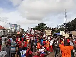 In 2019, the government agreed to the extension of a credit facility with the International Monetary Fund on the basis they would run a fiscal surplus, increase tax collection as a portion of GDP, reduce subsidies for petrol and electricity, increase investment in public infrastructure, reduce borrowing from the central bank and promote development of the private sector.[23] Following recommendations at the United Nation's Third International Conference on Financing for Development in Addis Ababa in October 2019, Condé announced that 15% of mining revenue would be dedicated to the National Agency for the Financing of Local Communities to boost local government, as well as introducing measures to raise tax collection from 13% to 15% of GDP.[24] This programme failed to bring immediate financial benefits for most citizens, with 60% of the labour force still working in the agricultural sector,[25] and the communities around the mines being inadequately compensated for land, water and health losses connected with the mineral extraction.[26][27][28]