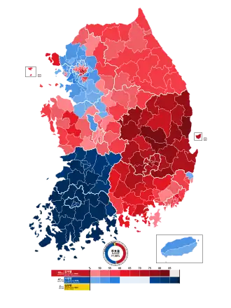 The party lost further ground in the 2020 National Assembly election.[53] However, the party has since regained ground after retaking the mayor's offices of Seoul and Busan in the 2021 South Korean by-elections. On matters of policy, politicians in this party generally support liberal economic policies (including support for chaebols,[54] the industrial conglomerates that dominate the South Korean economy) and hold conservative positions on national security, including hawkish stances on North Korea.[55] The party is particularly strong in the southeastern Gyeongsang region.[56]