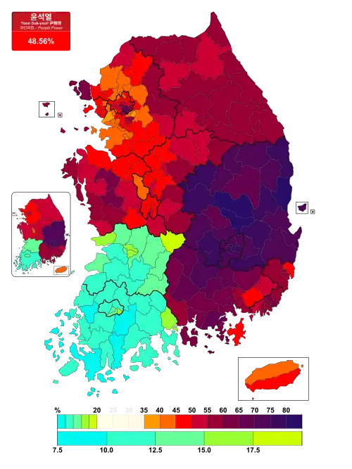 In the closest presidential election in South Korean history, Yoon won the most overall votes and the key area of Seoul, but lost in Gyeonggi Province and Incheon. In addition, this was the country's first ever direct presidential election in which the national winner failed to secure Jeju Province, a traditional bellwether region.