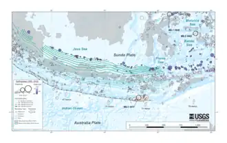 Java lies near an active convergent boundary that separates the Sunda plate to the north and the Australian plate to the south. At the boundary, marked by the Sunda Trench, the northward-moving Australian plate subducts beneath the Sunda plate. The subduction zone is capable of generating earthquakes of up to magnitude 8.7, while the Australian plate may also host deeper earthquakes within the downgoing lithosphere (intraslab earthquakes) beneath the coast of Java. The subduction zone produced two destructive earthquakes and tsunamis in 2006 and 1994. An intraslab earthquake in 2009 also caused severe destruction.[4]