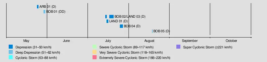 BOB 02/LAND 03 14–20 July Depression 45 km/h (30 mph) Not specified East India, Myanmar, Northeast India, Bangladesh, Central India, Northwest India, Pakistan Unknown None