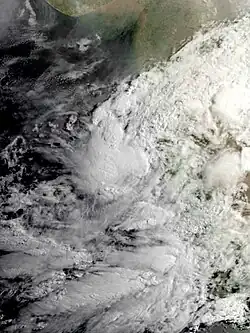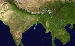 A low pressure area formed over northwest Bay of Bengal off the coast of Odisha at 08:30 IST on 27 May.[9] Favorable environmental conditions including warm sea surface temperatures, moderate vertical wind shear over the system and the presence of warm air over Gangetic West Bengal and Bangladesh allowed it to gradually consolidate. However, the strong wind shear in the region due to the advancing southwest monsoon and insufficient time over sea before landfall limited its intensification. It became well marked at 05:30 IST on 28 May and persisted over the same region.[10] By 05:30 IST on 29 May, the system coalesced into a depression near the coasts of West Bengal and Bangladesh.[11] Thereafter, the depression moved nearly northwards and by 08:30 IST on the same day, it intensified into a deep depression.[12] Over the next 6 hours, the system continued to move nearly northwards and made landfall on the West Bengal–Bangladesh coast between Sagar Island and Khepupara, close to Raidighi. Its maximum sustained windspeed at the time was 30 knots (56 km/h) gusting to 40 knots (74 km/h).[13] It then tracked north-northeastward inland,[14] and by 05:30 IST on 30 May the system had weakened back into a depression over Bangladesh.[15] By 17:30 IST on the same day, it had degenerated into a well marked low over Meghalaya due to interaction with rugged terrain.[16]