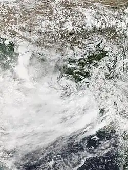 Under the influence of the tropical disturbance, a low pressure area formed over the eastern Arabian Sea off the southern Konkan-Goa coasts by 05:30 IST on 22 May.[3] By 05:30 IST on 23 May, it became a well marked low pressure area off the southern Konkan coast and persisted over the same region as of 08:30 IST.[4] The system organised into a depression by 05:30 IST on 24 May about 40 km northwest of Ratnagiri.[5] Over the next 6 hours, the depression moved slowly eastward at a speed of 5 km/h and between 11:30 and 12:30 IST it made landfall, crossing the south Konkan coast near Ratnagiri. The maximum sustained windspeed at the time was 25 knots (46 km/h) gusting to 35 knots (65 km/h).[6] The system then moved eastwards inland and[7] by 05:30 IST on 25 May, the system had weakened back into a well marked low pressure area over southern Madhya Maharastra and the adjoining regions of Marathwada and Karnataka.[8]