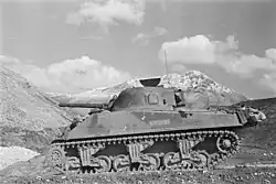 As at Orsogna, the 20th Armoured Regiment was to play a supporting role for the infantry in the forthcoming Cassino attack.[108] An earlier attempt by the New Zealanders in February to take Cassino had failed.[109] By this time, the regiment was under the command of Lieutenant Colonel J. Ferguson, who had previously led the 18th Armoured Regiment; Purcell had been sent to Egypt as commander of the Armoured Corps training depot there.[110] When a renewed attack began on 15 March, the regiment was initially held as a reserve, ready to exploit any breakthrough by the infantry but this did not eventuate. The infantry struggled to make progress in the face of determined resistance.[108] Over the next week, some of the squadrons of the regiment became involved in small scale raid actions,[111] the first of which was on 19 March. This involved 16 of the regiment's Shermans, along with 28 other armoured vehicles from United States and Indian units, advancing to the Monte Cassino monastery via a trail up the slopes of the mountain.[112] Although the German defenders lacked anti-tank guns, they were well dug in and supported by artillery and mortars. Without infantry support, the advance along the trail came to a halt. Soft ground stripped some tanks of their tracks and nine of the squadron's tanks were disabled or destroyed. The armour withdrew in the afternoon when it was noticed that the Germans appeared to be preparing a counterattack.[113][114]