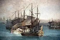 Posted to Menorca in 1755, the regiment deployed a detachment of 26 officers, 29 sergeants, 19 Drummers, and 678 other ranks as part of Lord Blakeney's garrison (with the 4th, 23rd and 24th Regiments).[14] As such they were besieged by a larger French force under Marshal Duke De Richelieu and retreated to Fort St Phillip. After a defence of two months' duration, at one point watching themselves being abandoned by the fleet under Admiral Byng, the British forces capitulated and retreated to Gibraltar.[15] A second battalion was formed in 1757 to serve as marines.[2] The regiment then took part in the raid on St Malo in June 1758, the raid on Cherbourg in August 1758 and the Battle of Saint Cast in September 1758.[16]