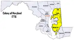 The first 5th Maryland Regiment was organized on March 27, 1776, comprising eight companies of volunteers from the counties of Queen Anne's, Kent, Caroline, and Dorchester of the colony of Maryland and was authorized on September 16, 1776, for service with the Continental Army.