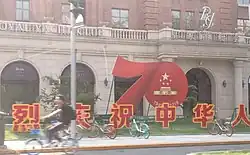 The capital was covered with red flags, adorning apartment compounds and neighbourhoods; banners reading "Today's China is the result of the work of Chinese people" were draped across overpasses, and topiaries were installed around the roads in Beijing.[8] The authorities gave out 620,000 television sets allowing those not invited to still be able to watch the festivities.[8]