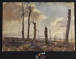At Pilckem Ridge, the opening phase of the Ypres offensive, II Corps was given the toughest objective, the capture of the Gheluvelt Plateau. Within the corps, 30th Division had the hardest task of all, but it had not recovered from its severe losses on the Somme and at Arras. Although General Headquarters had suggested replacing it with a fresher division, this had not been done. The infantry attacked at 03.50 on 31 July 1917 behind a creeping barrage, but despite 14 days of bombardment, the Germans' rearward positions were still intact, and their guns behind the Gheluvelt Plateau remained unsuppressed. 21st and 90th Brigades made slow progress through Sanctuary Wood, held up by machine guns, and were left behind by the barrage. The left battalion of 90th Bde lost direction and strayed into Chateau Wood instead of attacking Glencorse Wood, and erroneously reported that it had captured the latter. The brigade was checked on its first objective (the Blue Line) by German machine guns firing from strongpoints covering the second line and from Glencorse Wood. From 05.00 the Germans put down an intense barrage on Chateau Wood and Sanctuary Wood, causing a complete breakdown in communications to the rear, so that part of 89th Bde went forward to try to attack the third objective when the second was till untaken. 30th Division was criticised for its performance by the chief of staff of Fifth Army, and after the failure on the opening day of the Ypres offensive, 30th Division was not used offensively again in 1917.[7][11][15][21][22][23]