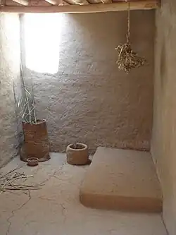 An estimated 30–40% of all the rooms at Aşıklı Höyük have hearths. This estimate is based on partially damaged and eroded structures possibly giving a number lower than accurate. Based on a limited group of fully exposed buildings 54% of single room units contained a hearth, while only 29% of the multiple room units. The average percentage on base of these building units is 47%, probably a more realistic estimate for the site in total.[23] Hearths do not occur in a courtyard context, and are more represented in single room dwellings than multiple room units. Still, multiple room units do have a substantial number of hearths. It has been suggested that the "multiroom dwellings may have functioned as 'incomplete' houses for new families still heavily dependent on the larger extended group".[24] The buildings containing the hearths do not show particular characteristics that distinguish them from structures without hearths; neither do they differ in size or special orientation. Even the hearth itself does not follow an apparent norm in terms of size or location. The position varies considerably, but it always has one side to the wall. The positioning of the hearth does not seem to be determined by general macro-ecological factors, such as prevailing wind directions, nor determined by cultural norms regarding spatial features within buildings.[21]