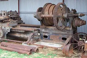 This twin bed lathe was made in 1881 at Aberdeen by J. Abernethy and Co. and brought to Sydney where it was used to turn columns for the Sydney GPO, The Queen Victoria Building and for the granite pedestal for the Queen Victoria statue in Queen's Square, Sydney. It was last in use at Loveridge and Hudson's Yard in Sydney in the 1960s.[1]