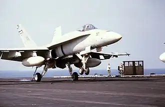 A VMFA-314 F/A-18A lands on USS Coral Sea