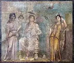 She is portrayed on some coins, carved stones, and mosaics in Roman Africa. A mosaic representing Roman Africa is found in the El Djem museum of Tunisia.[4][20][21] A sanctuary found in Timgad (Thamugadi in Berber) in Algeria features goddess Africa's iconography.[22] In Timgad, she was the main goddess of the great sanctuary of the Aqua Septimiana Felix, where she was worshipped as Dea Patria (goddess of the homeland).[23]