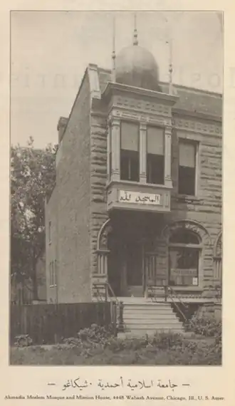 In 1922, Sadiq once again returned to Chicago and re-established the national headquarters of the movement at 4448 Wabash Avenue.[34] A converted house was used to serve as a mosque and a mission house. The mission house was from where the oldest Islamic magazine The Moslem Sunrise was to be published from. While based in Chicago, Sadiq continued to deliver his public lectures on Islam at schools, clubs and lodges across the Midwest. Many a times he was successful in removing misconceptions concerning the religion and occasionally his speeches attracted converts. In 1923, Sadiq gave multiple lectures at the Universal Negro Improvement Association, as a result of which he converted 40 members of the fraternal organization to Islam.[35][36] In September 1923, Sadiq left the United States for India. He was replaced by Muhammad Din, another missionary to the Community. During his three years, Sadiq had converted 700 Americans to Islam.[37] Named in honour of Mufti Muhammad Sadiq, Wabash Avenue is today the site of the Al-Sadiq Mosque, the oldest standing mosque in the United States.