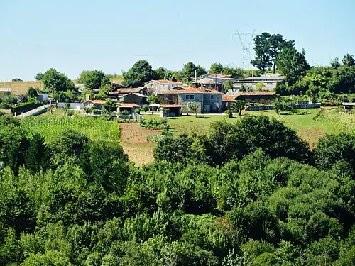Aiazo is placed in the south-west of the municipality of Frades (Ordes' shire), 30 km driving from Santiago de Compostela and 50 km driving from Coruña. By the south, Aiazo borders with the Arzúa's shire, by the Tambre river; by the north and the east it borders with the rest of Frades, and by the west with the municipality of Oroso. The relief, characterized by the Maruzo river (in the north) and Tambre river (in the south), over a geological area determined by the schist complex of Ordes, forms a landscape with soft hills.[1] In Aiazo there are agrarian lands and forests around the populated areas. The forests are mostly of eucalyptus and pines in plantations, and Galician typical oak forest, with oaks, birchs, alders, willows, etc. Another frequent kind of forest in Aiazo is the riverbank forest near the Tambre, Gaiteiro, and Maruzo rivers. Maruzo's riverbank is part of the Río Tambre's ecological network Natura 2000, this protection will be increased in the future to the Tambre's riverbank. In the beginning, Aiazo's population was concentrated in the three principal neighborhoods, born around an aquifer. Historically Fontelo, Fonsá and A Devesa were the most important villages, the three with similar characteristics of terraced houses. To complement the three first settlements, country houses appeared, like Os Pereiros, in A Devesa, or O Casal, in Fontelo, and new settlements grew, like A Torre or A Carballeira. In the late 20th century, many isolated houses appeared, some of them following a ribbon development in the way between Ponte Carreira and Ordes, and other around the primary neighborhoods.[1] Population ageing is a phenomenon occurring in Aiazo, although in recent years the tendency has been to receive immigrants, especially because of the 2008 crisis.