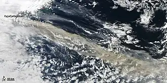The eruption occurred beneath glacial ice. The cold water from the melting ice chilled the lava quickly, causing it to fragment into very small particles of glass (silica) and ash, which were carried into the eruption plume. The extremely fine ash particles and the large volume of steam from the glacial meltwater sent an ash plume hazardous to aircraft rapidly high into the upper atmosphere.[11] The presence and location of the plume depended upon the state of the eruption and the winds. The large amount of glacial meltwater flowing into the eruption vent made this eruption so explosive that it ejected its ash plume directly into the jet stream, which was unusually stable and south-easterly.[12] The ash was then carried over Europe into some of the busiest airspace in the world.