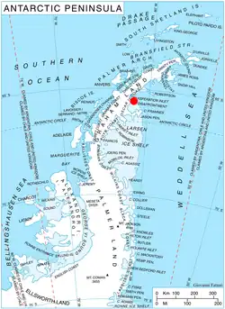 Akra Peninsula (Bulgarian: полуостров Акра, romanizedpoluostrov Akra, IPA: [poɫuˈɔstrof ˈakrɐ]) is the mostly ice-covered peninsula projecting 11 km eastwards from Oscar II Coast in Graham Land, and 5.2 km wide, bounded by Exasperation Inlet to the north and Scar Inlet to the south, and ending in Cape Disappointment to the east. It was formed as a result of the break-up of Larsen Ice Shelf in the area, and the retreat of Pequod Glacier in the early 21st century. The feature is named after the ancient town of Akra in Southeastern Bulgaria.