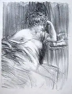 Belleroche took a studio in Montmartre in Paris, and in 1900 transitioned from painting in oil to creating lithographs, predominantly of women.[7] He created his works using wax crayon on stone.[4] He entered into a ten-year relationship with Lili Grenier, who modeled for Henri de Toulouse-Lautrec.[4][7] At the Salon d'Automne in 1904, a room was dedicated to his paintings and lithographs.[4]