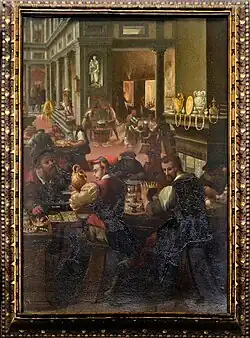 Fei's artistic career flourished as he became involved in significant decorative projects and large commissions. His most notable works include frescoes for the decoration of Palazzo Vecchio in Florence, where he contributed to both the artistic and architectural embellishment of the palace. This work was part of a broader effort to adorn the home of the Medici family, reflecting their wealth and political power. Fei's style, which incorporated detailed, almost Flemish-like realism, was an appropriate choice for the Medici family, as it emphasized their political and social prestige. He participated in the Vasari-directed decoration of the Studiolo of Francesco I with an oval canvas relating a Goldsmith Shop story. He also painted an altarpiece on the Flagellation of Christ for the Basilica church of Santa Croce in Florence. Trained under Ridolfo del Ghirlandaio. Piero Francia, and under Tommaso Manzuoli, better known as Maso da San Friano, Fei became a member of the Accademia dell’Arte e del Disegno in Florence in 1563 and was a trusted assistant of Giorgio Vasari up until 1574. During the late 1570s, Fei was also involved in the decoration of the chapel of Francesco I de’ Medici, another important commission linked to the Medici court. Additionally, Fei's works extended to the Vatican, where he participated in the decoration of the Sistine Chapel under the supervision of Giorgio Vasari. His works, although often smaller in scale, played a role in the larger efforts to enrich the religious and political significance of these spaces.