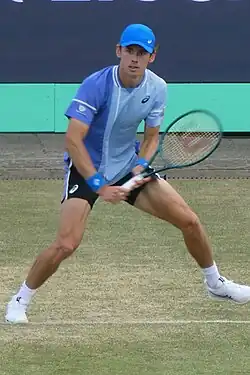 Seeded No. 27 at the 2019 Australian Open, he lost in the third round to Rafael Nadal.[46] De Minaur reached a then career-high ranking of World No. 24 in March 2019.[47] Following the Australian Open, De Minaur suffered a groin injury, sidelining him for two months.[48] At Wimbledon, De Minaur won his opening round before losing to Steve Johnson in the second round in five sets.[49] De Minaur made his fourth ATP Final in Atlanta where he defeated Taylor Fritz to clinch the trophy.[50] He did not face a single break point in the four matches he played during the tournament, winning 116 of 123 first serve points.[51][52]