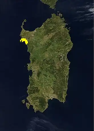A satellite photo of the island of Sardinia with the location of the Algherese-speaking area being marked in yellow.