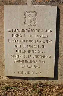 The restoration of this well, started in 2007 and completed in 2009, was unveiled by Mayor of Campos Mr. Guillem Ginard Sala and President of the Commonwealth of South Mallorca Mr. Joan Juan Pons. 8 May 2009