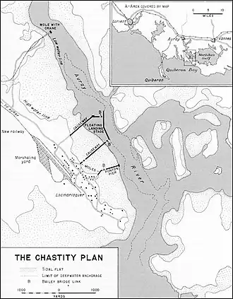 Logistical support of the American armies would therefore depend on the ports of Brittany, principally Brest, Lorient and Quiberon Bay. Along with Saint-Malo, they were expected to have a capacity of 17,500 measurement tons (19,800 m3) per day. Of this, 10,000 measurement tons (11,000 m3) per day were expected to come through Quiberon Bay, as it was anticipated that the ports would suffer considerable damage in the fighting, or through German demolitions. Studies indicated that Quiberon Bay had an anchorage sufficient for 200 ships, 3,000 yards (2,700 m) of beaches with the required slope for landing craft, and four minor ports close by where deep-water piers could be constructed. A detailed plan known as Operation Chastity was drawn up to develop the area.[9] Crucially, the Overlord plan called for a one-month pause at the Seine, which was expected to be reached by D plus 90, in order to build up supplies and logistical infrastructure before advancing further.[10] The expectation of an advance at a prescribed rate, while necessary for planning purposes, built inflexibility into a logistics plan that already had little margin for error. Staff studies confirmed that Overlord could be supported if everything went according to plan, but no one expected that it would.[11][12]