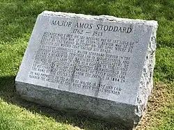 According to a diary kept by Captain Daniel Cushing, Major Stoddard was buried in front of the Grand Battery at Fort Meigs. A stone monument inside the fort honors his memory today. Stoddard County, Missouri, was named for him.[8]