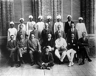 Wellcome Tropical Research Laboratory, Khartoum. Henry Wellcome is sat centrally with white pith helmet on lap; Balfour is to his right.