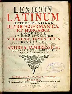 The multilingual dictionary, Lexicon Latinum interpretatione Illyrica, Germanica et Hungarica locuples & index illirico sive croatico-latinus represents an important monument in studies of linguistics, lexicography, comparative Slavistics and dialectology. The Croatian counterpart, named Illyrian, is written in the Kajkavian dialect, but with elements of Shtokavian and Chakavian. The linguistic purism is reflected in numerous translated, and newly coined words, particularly in scientific terminology.[4] The dictionary was released only two years after a similar dictionary by Ivan Belostenec was published by the Paulines, which would indicate competition between them and the Jesuits.[1]