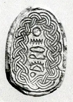 Anra scarabs are scarab seals dating to the Second Intermediate Period found in the Levant, Egypt and Nubia.[1] Anra scarabs are identified by an undeciphered and variable sequence of Egyptian hieroglyphs on the base of the scarab which always include the symbols a, n and r.[2] As anra scarabs have overwhelmingly been found in Palestine (~80%), it has been suggested it was marketed by the contemporaneous 15th Dynasty for the Canaanites.[3]: 277
