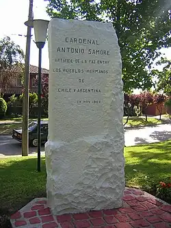 From 1978 to 1983, he acted as a special representative of Pope John Paul II, earning Samorè the nickname "the Vatican Kissinger",[4] for mediating the dispute between Chile and Argentina, which were on the brink of war because of a disagreement concerning the ownership of the strategic Picton, Lennox and Nueva islands during the Beagle conflict. The international pass of Puyehue that links Osorno in Chile with Bariloche (Argentina) was later renamed Cardenal Antonio Samorè Pass.