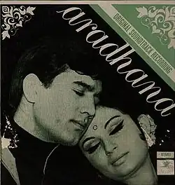 Aradhana (transl.Worship) is a 1969 Indian Hindi musical romantic drama film directed by Shakti Samanta, starring Sharmila Tagore and Rajesh Khanna. It won the Filmfare Award for Best Film at the 17th Filmfare Awards. Tagore gave one of the best performances of her career and won Filmfare Best Actress Award.[1] Originally released in Hindi[2] and dubbed in Bengali, Aradhana's huge success led to two remakes: the Tamil film Sivagamiyin Selvan (1974)[3] and the Telugu film Kannavari Kalalu (1974).[4] This film is counted among the 17 consecutive hit films of Rajesh Khanna between 1969 and 1971, by adding the two hero films Marayada and Andaz to the 15 consecutive solo hits he gave from 1969 to 1971.[5] Aradhana was a blockbuster in India and the Soviet Union.[6] The theme of the movie was based on the 1946 film To Each His Own.[7] Its run time is 169 minutes.