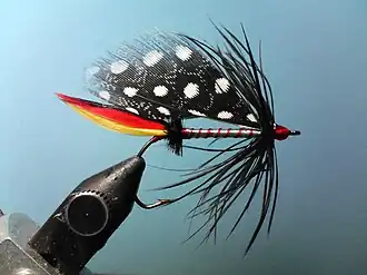 A tube fly is a general tying style of artificial fly. Tube flies differ from traditional artificial flies as they are tied on small diameter tubes, not hooks. Tube flies were originated in Aberdeen, Scotland by fly-dresser Minnie Morawski for Atlantic salmon anglers around 1945.[42] Tube flies were designed to improve hooking success and to prevent damage to complex and expensive salmon flies by the teeth of hooked salmon. Tube flies have been widely adapted to fly patterns for a variety of cold water and warm water species and are extremely popular for steelhead and salmon in the Pacific Northwest and northeast United States, as well as saltwater species along the Atlantic, Florida and Gulf Coasts. They are widely used in European waters for Atlantic salmon, sea trout and pike.[2]