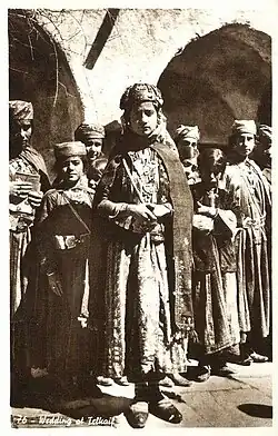 The Burakha (Syriac: ܒܘܼܪܵܟ݂ܵܐ) is a wedding tradition where the bride and groom are blessed by a priest in a church.[2][21] This traditionally lasted about four hours, but more recently the event goes for about one hour. Pins in the shape of two crosses are usually placed on the groom's back, as a symbol of protection of the groom for the incoming marriage.[15] There are some details during the ceremony that differ from village to village. To ward off evil spirits, the Assyrians of Baz are known to have someone poke the groom with a needle to ward off any evil spirits while Assyrians from Tyari make noise with the cutting motion of scissors.[22] The tradition of the priest's blessing and the pinned crosses is also present among Chaldo-Assyrians from Iraq,[23] while that of the blessing is present amongst Assyrians from Turkey.[24] Assyrian marriages in Turkey are not carried out by the priest until they receive official documentation for the wedded couple.[12]