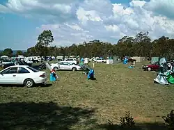 Early arrivals at the 2003 South Pacific Star Party start setting up their telescopes on the observing field.