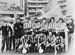Both clubs fielded teams of a single nationality in the showpiece first leg at the Stadio Comunale on 4 May before a 75,000 crowd, with the only goal scored by the hosts' Marco Tardelli.[44][46][60][61] In the return on 18 May, an early away goal by Juve's Roberto Bettega left Athletic with a tough task to score three against the side that were about to be crowned Serie A champions, had only conceded 20 goals in the league and given up just one to each of their UEFA Cup opponents that season.[62] Athletic quickly equalised on the night through Irureta, but could not find another goal until Carlos scored the second on 78 minutes. A frantic last portion of the match failed to produce the vital third goal, the tie finished 2–2 and Juventus claimed their first European trophy on the away goals rule.[44][46][61][63] A few weeks later, Athletic suffered further disappointment when they lost the 1977 Copa del Rey Final in a penalty shoot–out to Real Betis.[64]