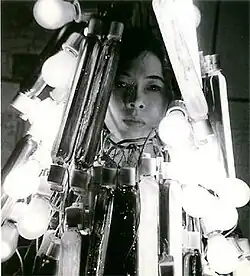 Tanaka's well-known Electric Dress (1956) was a garment made of 200 lightbulbs that weighed over 50 kg. At the "2nd Gutai Art Exhibition" held in 1956, Tanaka wore Electric Dress and walked around in the gallery. Photographs of the performance show Tanaka covered from head to toe in the garment, with only her face and hands visible.[1] The colored light bulbs flickered randomly, giving off the sensation of an alien creature and, according to Tanaka, "blink[ing] like fireworks."[17]