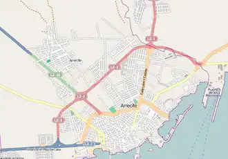 Since Arrecife is a coastal city, the ring road does not complete a full circle. On the northern side, LZ-3 begins at a roundabout by the island's main port, Puerto de los Mármoles. On the southern side, LZ-3 ends at a junction with LZ-2, the main road leading to the south of the island. LZ-3 is also connected to LZ-1, the main road leading to the north of the island. Thus, the island's north-south axis is LZ-1–LZ-3–LZ-2, connecting the northernmost town, Órzola, to the southernmost town, Playa Blanca.