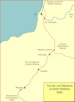 The Ayr and Maybole Junction Railway (A&MJR) was a railway in Ayrshire, Scotland that provided services between Ayr and Maybole. It opened in 1856 and was seen as a link in providing a through line between Glasgow and Portpatrick, then the ferry port for the north of Ireland.
