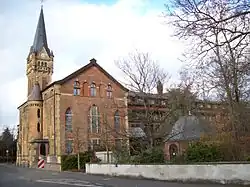 - Augustinian convent of Saint Peter, endowed by Rhinegrave Wolfram I (III) of Stein (d. about 1179) about 1140,[35] incorporated into the Schwabenheim Augustinian monastery in 1437, moved to the so-called Bubenkapelle ("Lads' Chapel") in 1491, reoccupied in 1495, dissolved in 1566/1568; the 15 nuns who were driven out went to Eibingen Abbey. In 1624, an attempt to reoccupy the complex by Augustinian monks failed; Jesuits settled there in 1636 and in 1648 they were granted it by agreement, today Oranienhof. The Pietà from Saint Peter, for whose reverence a forty-day indulgence was secured from Pope Alexander VI in 1502, was kept until its destruction in 1942 at St. Quintin's Church, Mainz.
