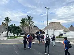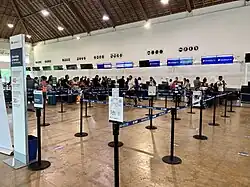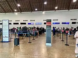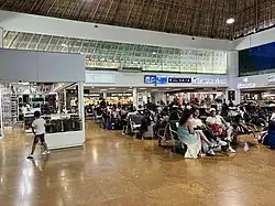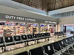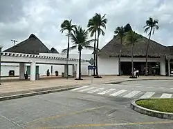 The passenger terminal houses both arrival and departure facilities for domestic and international flights within a single-story building spanning 8,132 square metres (87,530 sq ft). The terminal's distinctive architecture features a series of thatched roof structures crafted from dried palm leaves, known as Palapas, a traditional construction technique frequently seen on Mexican beaches. The terminal has eight gates, a VIP lounge,[4] dining options, duty-free shops, parking areas, car rental services, various retail stores, and a bus terminal for shuttle services and airport transfers to tourist resorts in the region.